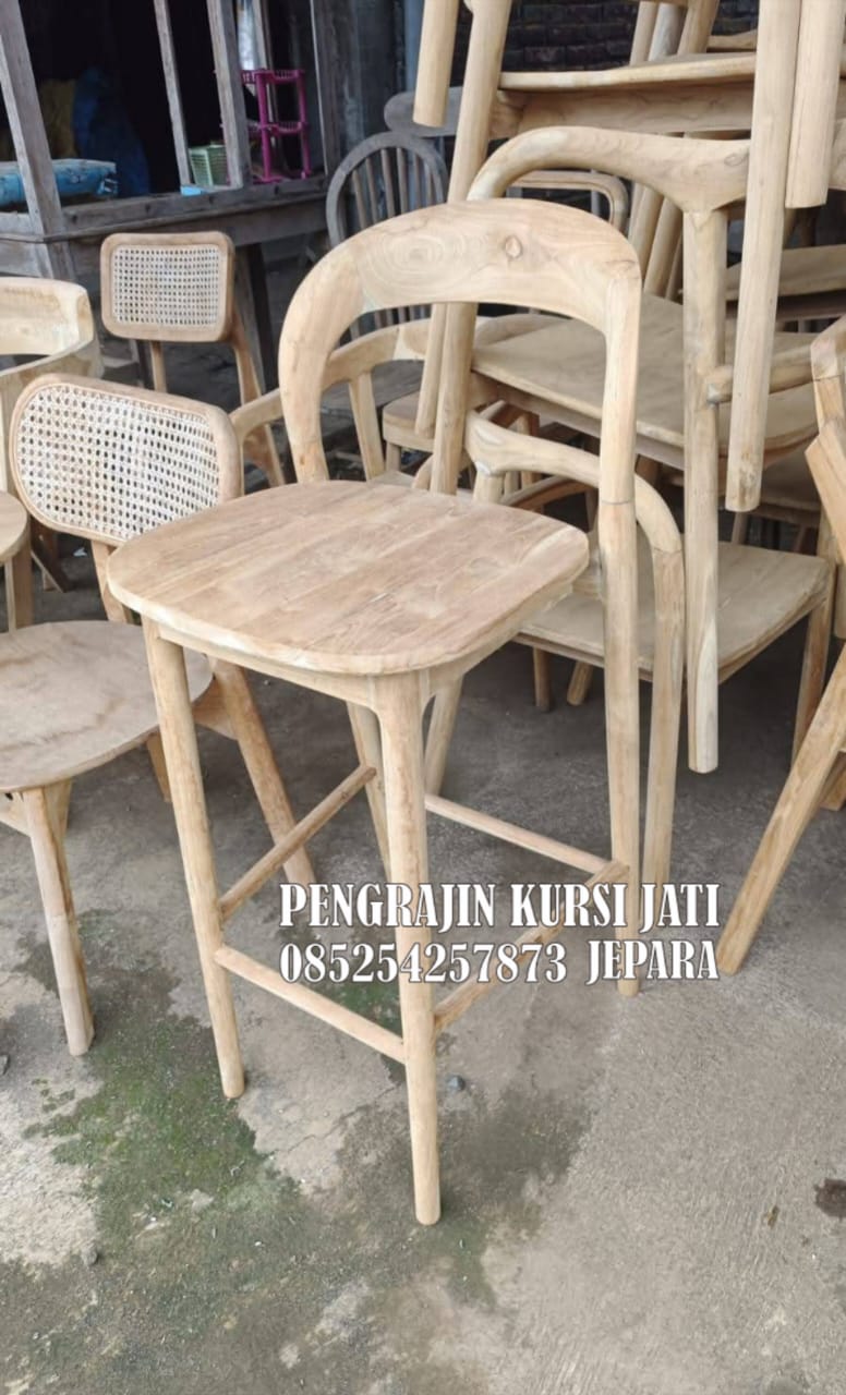 Kursi bar jati pada gambar merupakan produk berkualitas tinggi hasil produksi pengrajin mebel Jepara yang dikenal akan ketelitian serta keahliannya dalam mengolah kayu jati. Mengusung desain minimalis modern, kursi ini cocok digunakan pada café, rumah makan, minibar rumah, dapur modern, coffee shop, dan berbagai ruang komersial lainnya. Material yang digunakan adalah kayu jati solid, terkenal dengan daya tahan luar biasa terhadap cuaca, air, rayap, serta memiliki serat kayu indah yang meningkatkan kesan natural dan premium.